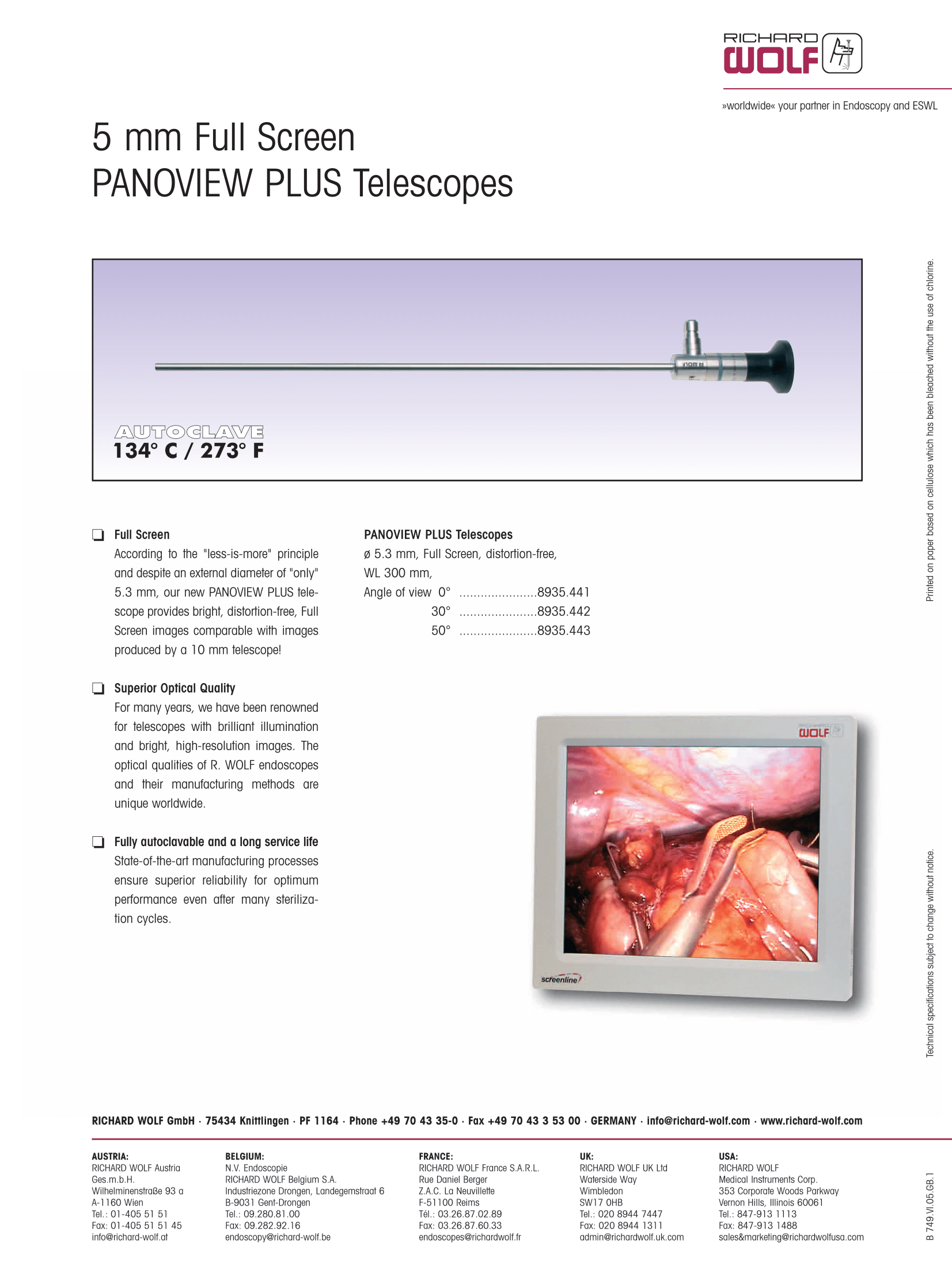 Full Screen According to the "less-is-more" principle and despite an external diameter of "only" 5.3 mm, our new PANOVIEW PLUS telescope provides bright, distortion-free, Full Screen images comparable with images produced by a 10 mm telescope! R Superior Optical Quality For many years, we have been renowned for telescopes with brilliant illumination and bright, high-resolution images. The optical qualities of R. WOLF endoscopes and their manufacturing methods are unique worldwide. R Fully autoclavable and a long service life State-of-the-art manufacturing processes ensure superior reliability for optimum performance even after many sterilization cycles.