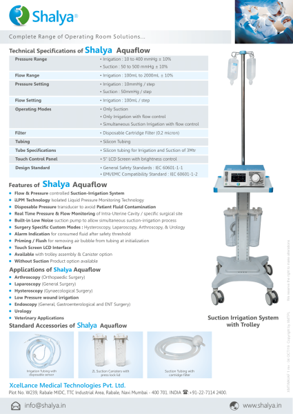 AQUAFLOW HAS FOUR APPLICATION: ARHTROSCOPY, LAPAROSCOPY, UROLOGY, HYSTEROSCOPY, ENDOSCOPY AND TURBO MODE. REAL TIME FLOW AND PRESSURE MONITORING SYSTEM. PRIMING AND FLUSH AVAILABLE.RENEWABLE AND AUTOCLAVABLE TUBING. TOUCH SCREEN FOR BETTER USER INTERFACE. LOW NOISE BUILT IN SUCTION.